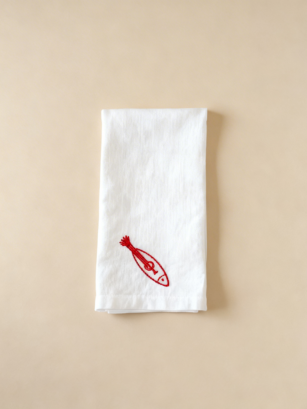 Confeccionados em 100% linho branco, distinguem-se pela sua textura natural, leveza e durabilidade. O bordado minimalista da sardinha — disponível em diferentes cores — introduz um detalhe delicado, inspirado na tradição, mas pensado para um uso atual.