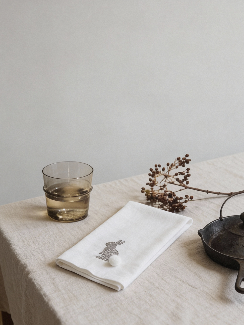 O Guardanapo Rabbit traz um toque delicado e descontraído à mesa, combinando a nobreza do linho com um detalhe inesperado e cheio de personalidade. Confeccionado em 100% linho, destaca-se pela aplicação bordada do coelho, finalizada com um pequeno pompom que faz de rabo, acrescentando textura e um apontamento lúdico à peça.